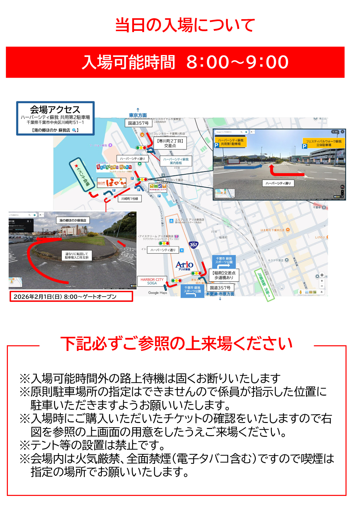 チケットをお持ちでない方の自動車での入場はできませんが当日券(5,000円/電子決済のみ)の販売がございますのでご希望の方は入場口でお買い求めください。